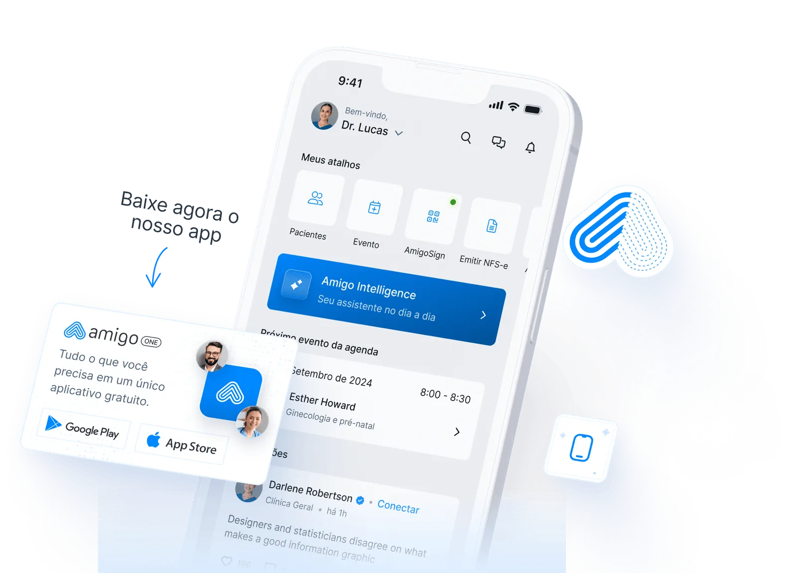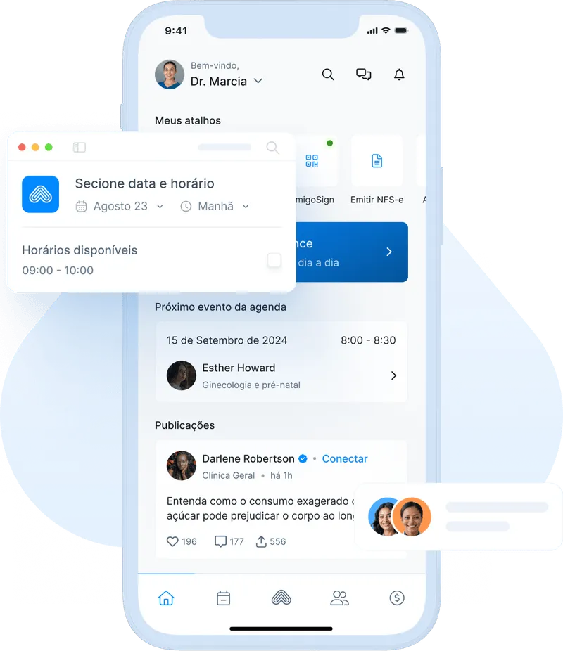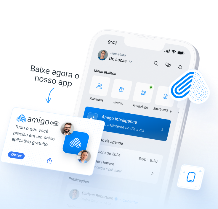Com o Amigo One, você tem tudo no bolso: prontuário, prescrição, agenda, cobrança e inteligência clínica.